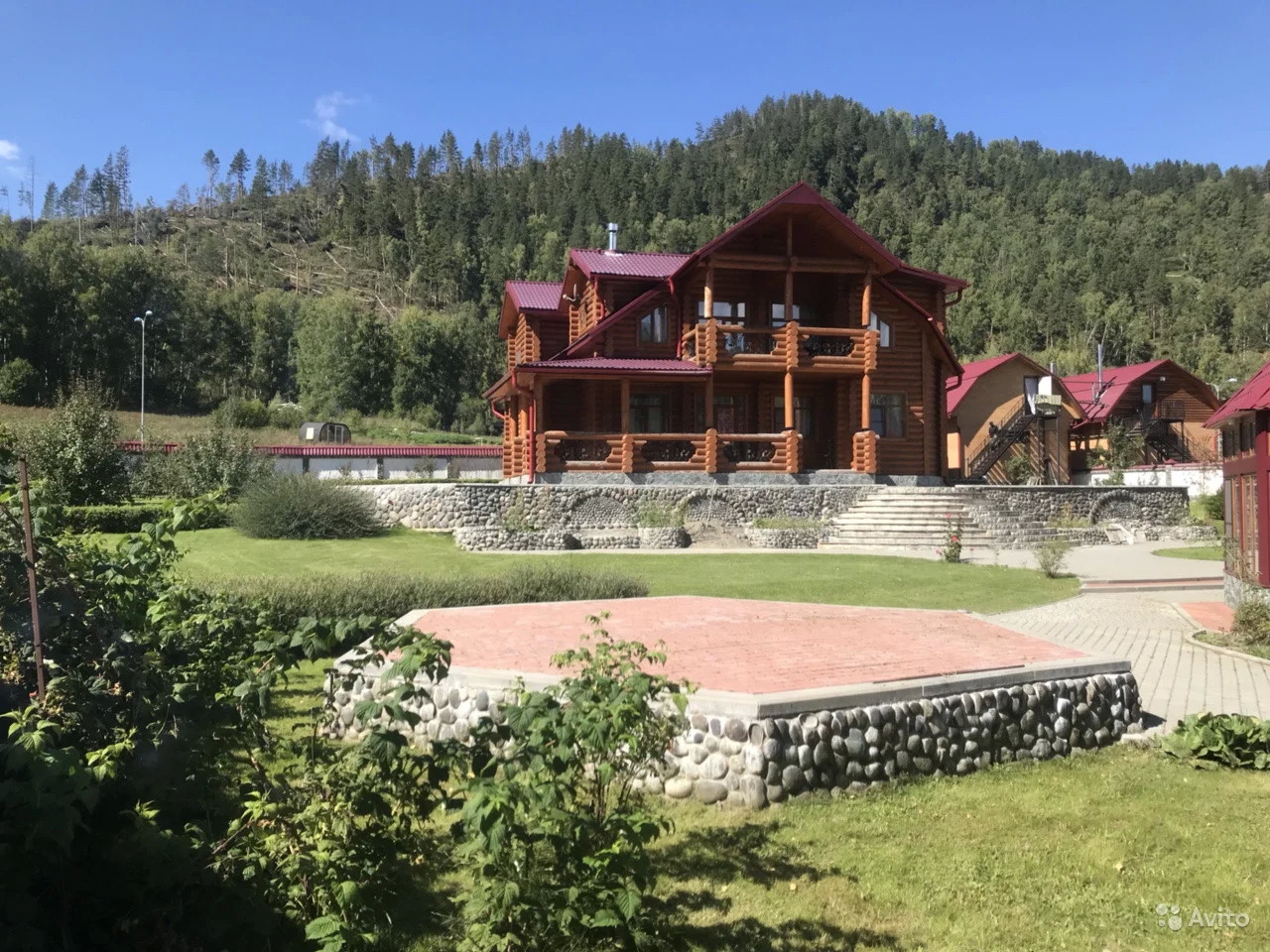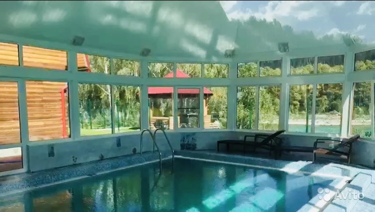 Также на территории есть летний бассейн в отдельно стоящем строении со стеклянными стенами и под крышей. Растет свой сад из яблоневых, грушевых деревьев, малины, туи и других плодоносящих культур. Свободная территория усеяна зеленым газоном. Кроме этого, есть собственный спуск к берегу реки Катунь, где расположена беседка для отдыха. «Есть своя скважина с чистой водой (проводился химический анализ). Очень красивое место. Дизайнерское оформление участка и отделка дома. Можно использовать как базу отдыха», — приводятся данные с «Авито».