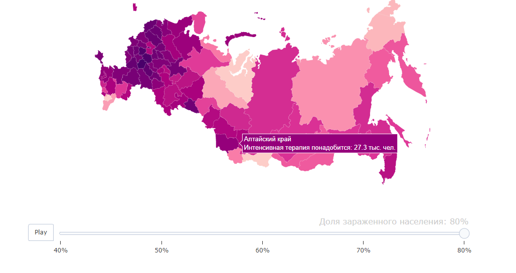 Согласно приблизительным подсчетам, в случае, если 40 % населения Алтайского края подвергнется заражению, интенсивная терапия понадобится 13,7 тысяч человек. При 80 % зараженных внимание медиков потребуется 27,3 тысяч человек, то есть почти 1 % населения региона. Для Республики Алтай ситуация значительно менее критична, так как при 40 % зараженных терапия может понадобиться всего 800 людям, а при двукратном росте – 1,7 тысяче человек.