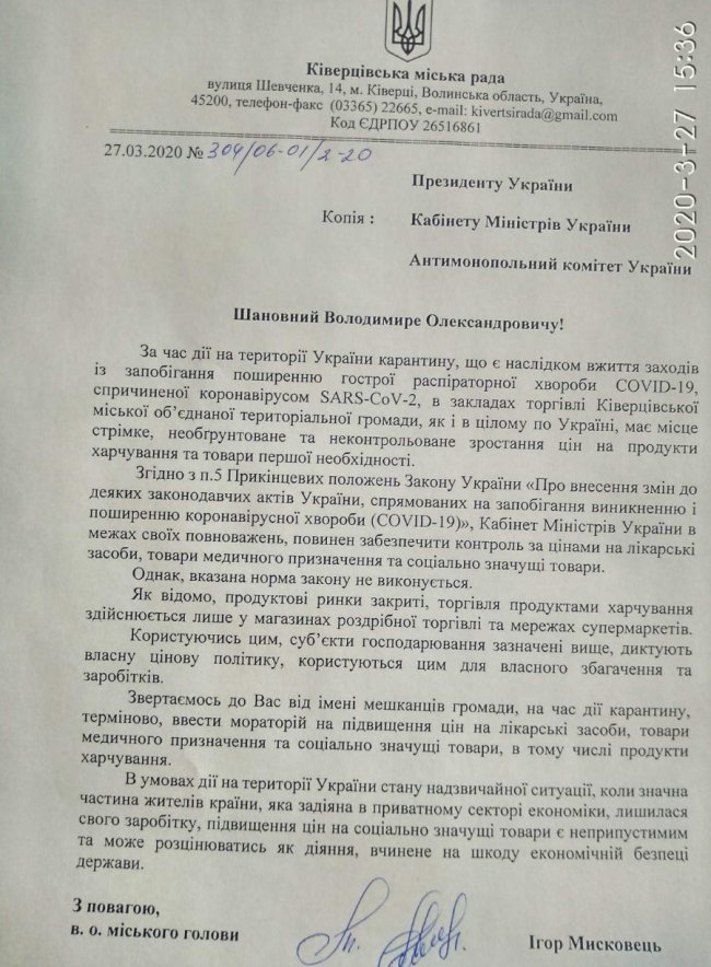 Ківерцівська міська рада звернулася до президента України Володимира Зеленського та контролюючих органів через суттєве здорожчання продуктів харчування та товарів першої необхідності у період карантину.