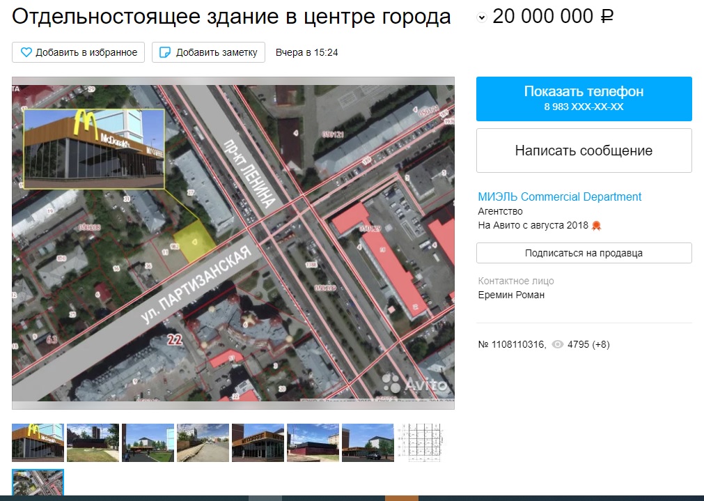 Опубликованное 16 марта объявление практически полностью повторяет объявление о продаже того здания, в котором сейчас находится «Черный квадрат». Агентом тогда также выступало «Миэль». Совпадает даже цена – 20 млн рублей. То объявление было опубликовано еще в июле 2019 года. Судя по публикации, изображения и текст были использованы из старого объявления, также указания на земельный участок, где уже стоит кофейня. Подчеркивается, что использованные на фасаде бренды не имеют отношения к зданию, а приложены для примера.