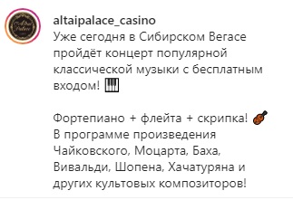 Несмотря на то, что на территории Алтайского края с 26 марта был введен запрет на работу широкого перечня заведений из-за угрозы распространения коронавируса, отдельные руководители, похоже, решили продолжить работу. Так, например, единственный резидент игорной зоны «Сибирская монета» — казино Altai Palace – бравурно сообщает, что не собирается закрываться, и даже зовет всех на концерт.