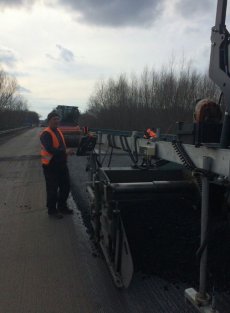 7 березня підрядне підприємство ТзОВ «Автомагістраль-Південь» приступило до влаштування вирівнюючого шару дорожнього одягу на відфрезерованій ділянці автошляху.