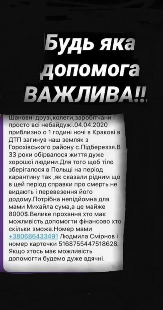 Для того, аби його тіло зберігалося у Польщі на період карантину, потрібна непідйомна для мами Михайла сума – 8 тисяч доларів. Всіх небайдужих просять допомогти зібрати ці кошти.